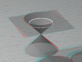 Examine the two graphic images to the right on this page. Click the top image repeatedly to cycle through the conic section images for a circle, ellipse, parabola and hyperbola. If you have a pair of anaglyphic eyeglasses (recommended), put them on and click the lower image in the same way for 3D views of the conic sections.