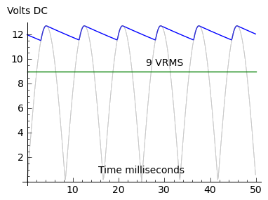 The peak voltage of an RMS AC source is equal to: $\text{RMS} \times \sqrt{2}$.- The radio's bridge rectifier (D16) and filtering capacitor (C155) have the effect of converting the source 9 V RMS AC into a peak voltage of ($9 \times \sqrt{2}$) = 12.72 VDC.