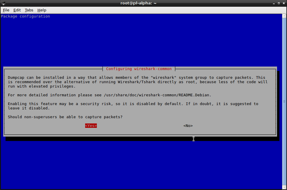 # dpkg-reconfigure wireshark-commonThe above should produce this dialog: